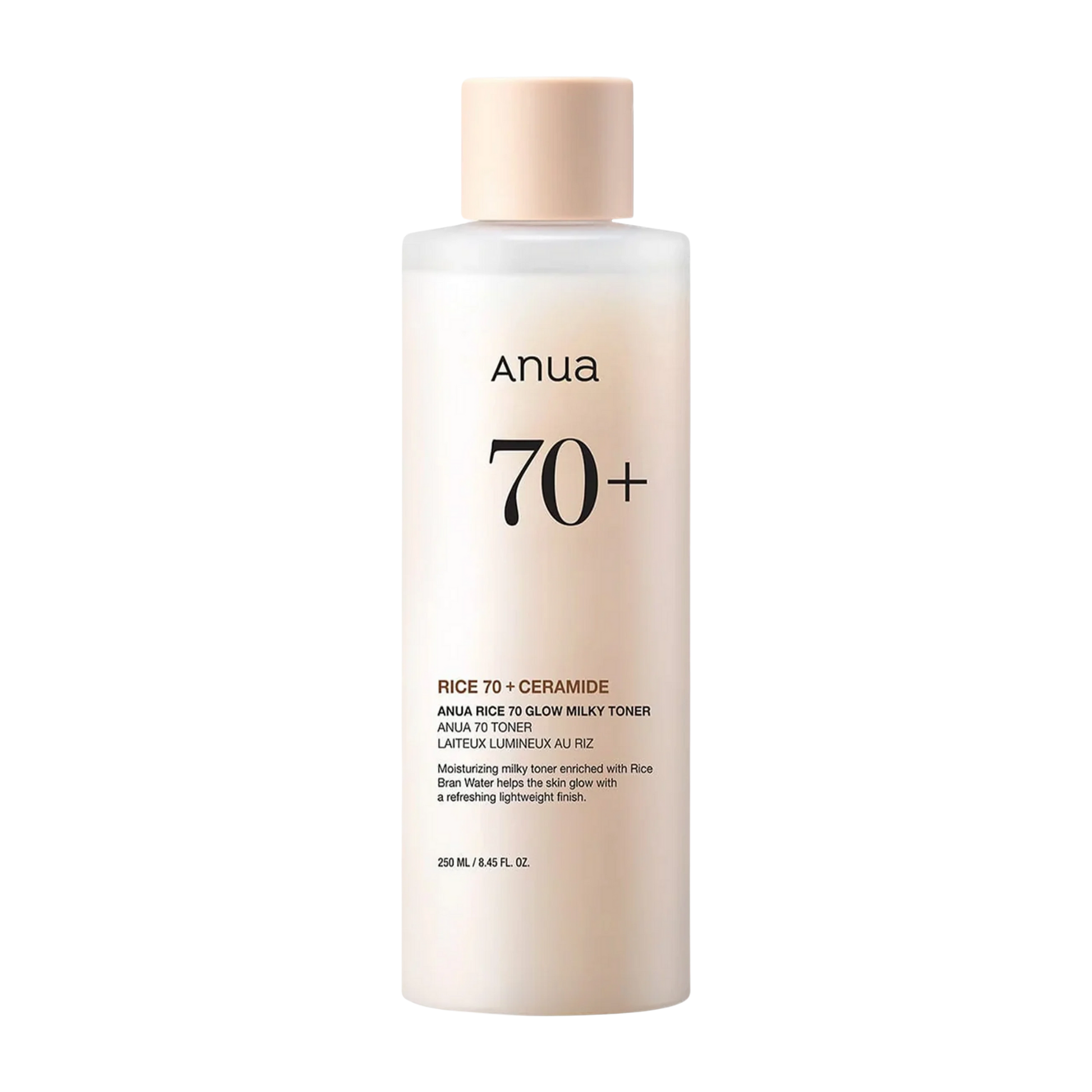 The ANUA Rice 70 Glow Milky Toner is a brightening and hydrating Korean toner formulated with 70% rice extract to deeply nourish, smooth, and revitalize dull skin. Its lightweight milky texture absorbs easily, helping to enhance skin radiance, refine texture, and leave the complexion soft, supple, and glowing.